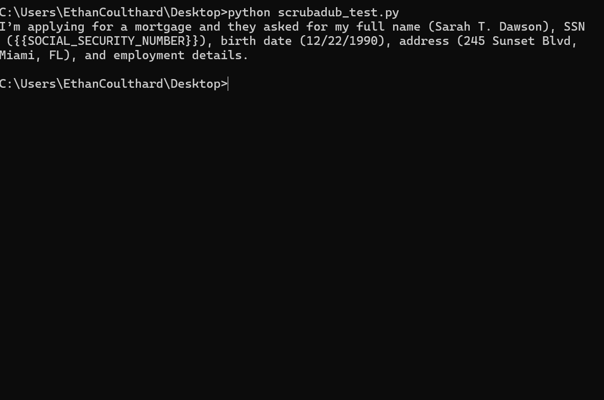 The demo will be done with the following text: "I’m applying for a mortgage and they asked for my full name (Sarah T. Dawson), SSN (456-78-9012), birth date (12/22/1990), address (245 Sunset Blvd, Miami, FL), and employment details."